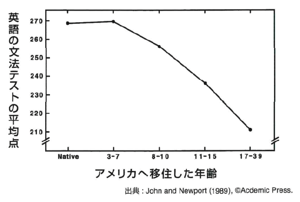 文法のテストにおいても臨界期である10歳を過ぎてから学習を始めると、点数が著しく下がる結果になっています。 英語学習を開始した年齢が文法力にも影響を及ぼしていると言えるのです。